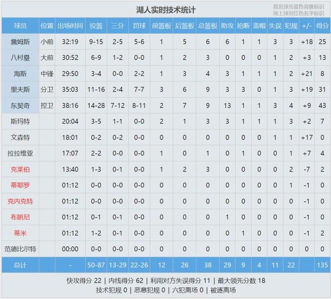 邓恩被直接驱逐,海斯吃了个技术犯规。比赛已经没悬念了,全场结束,湖人135-118大胜快船。湖人双喜临门:重返西部第二;小组出线,锁定NBA杯的淘汰赛资格。东契奇43分9板13助、里夫斯31分9板3助、詹姆斯25分6板6助。