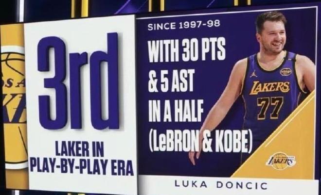 东契奇半场贡献32分3板6助的亮眼数据,成为NBA历史上继科比和詹姆斯之后,第三位在半场打出30+5数据的球员。